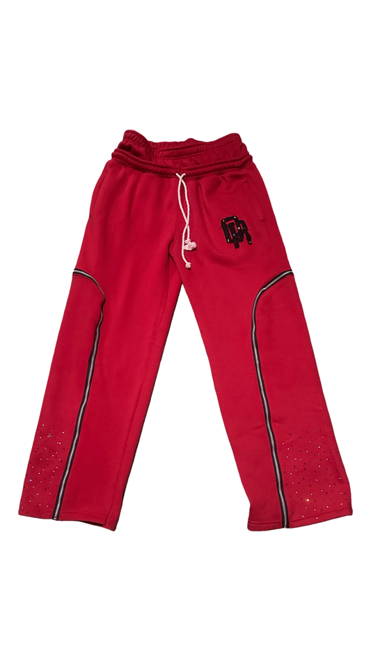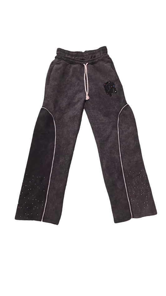 QR premium velour rhinestone shorts with embroidered 'QUALITY REMAINS' stamp on elastic waistline, embroidered distressed...