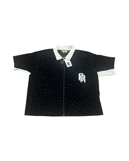 QR premium velour rhinestone collared shirt with distressed embroidered 'QR' stamp on front, distressed embroidered...