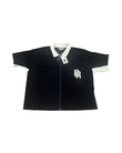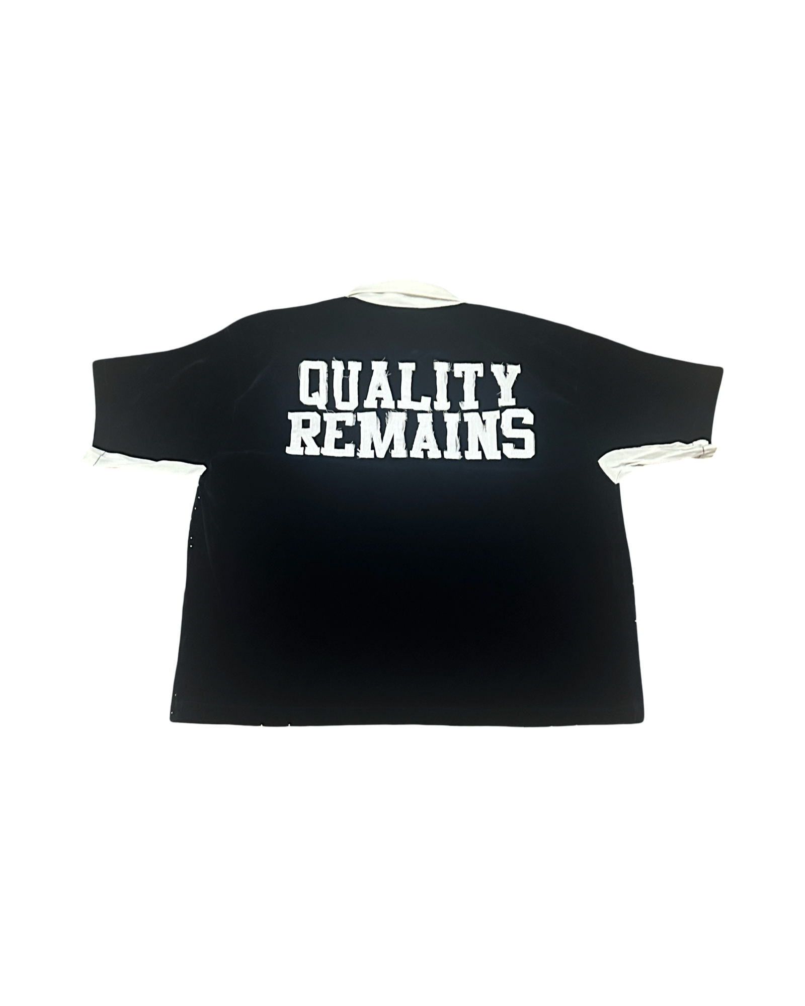 QR premium velour rhinestone collared shirt with distressed embroidered 'QR' stamp on front, distressed embroidered 'QUALITY REMAINS' logo on back, crop fit